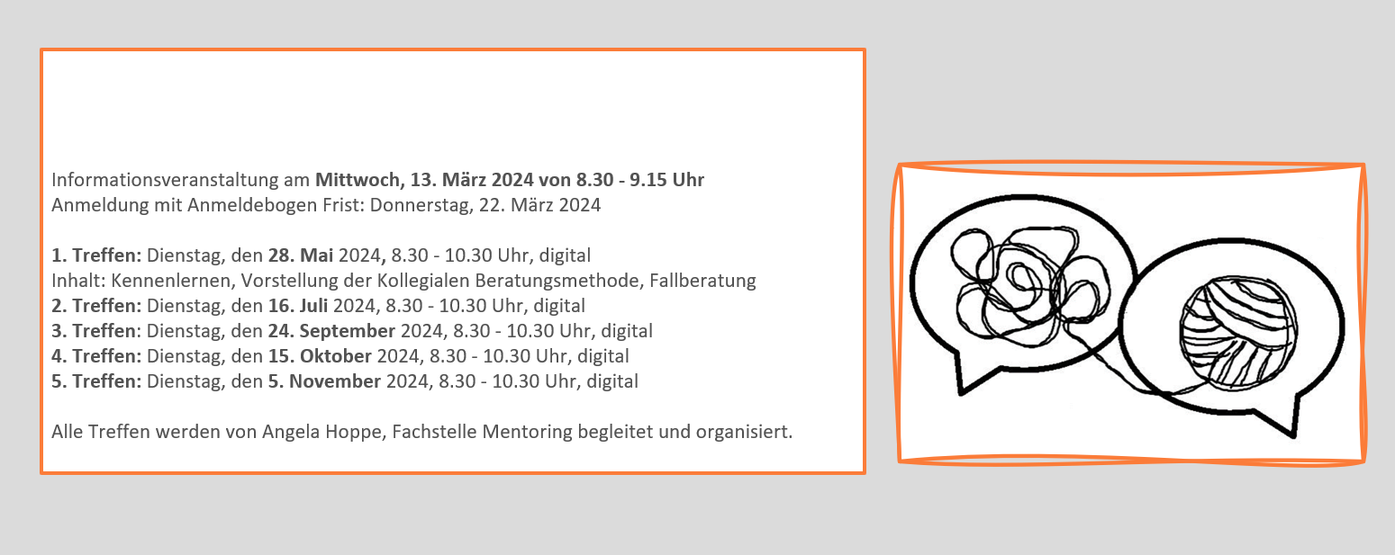 Eine Kollegiale Beratung ermöglicht, sich nach einer vorgegebenen Ablaufstruktur in einer kleinen Gruppe (5 – 8 Pers) wechselseitig auf Augenhöhe zu beraten. Dabei steht die jeweilige „Fallgeberin“ sowie ihre Suche nach einem für sie passenden Lösungsschritt im Mittelpunkt.
