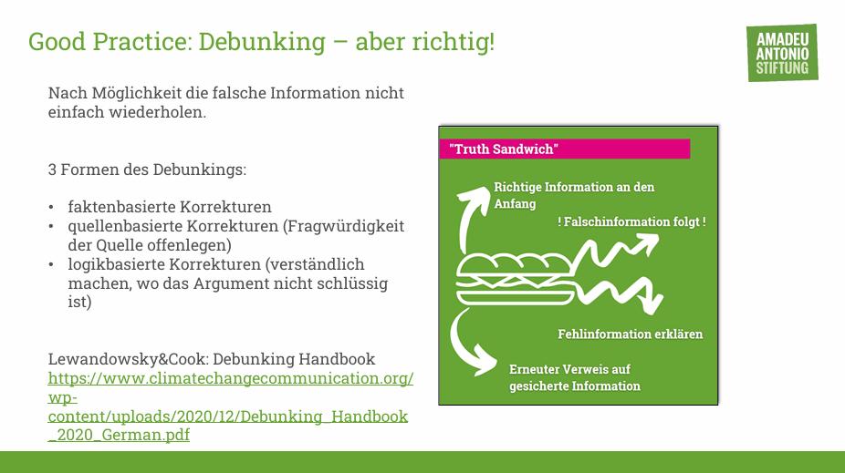 Teresa Sündermann von der Amadeu Antonio Stiftung klärte auf: Wie lässt sich Kommunikation und Positionierung gestalten, wenn Emotionen hochkochen und der Kontakt immer aufreibender, belastender und bedrohlich wird? Wie gelingt es, handlungsfähig zu bleiben? Im Laufe des Worshops gab es Informationen zu Wirkungsweisen und Hinweise zur frühzeitigen Beobachtung von Störstrategien sowie erste Handlungsschritte und Anlaufstellen zur Unterstützung. Denn Shitstorms sind als politisches motiviertes Mittel und Störstrategie der (organisierten) extremen Rechten bis hinein in konservative Kreise gegenüber zivilgesellschaftlichen Organisationen und progressiven Stimmen in der Gesellschaft zu verstehen.