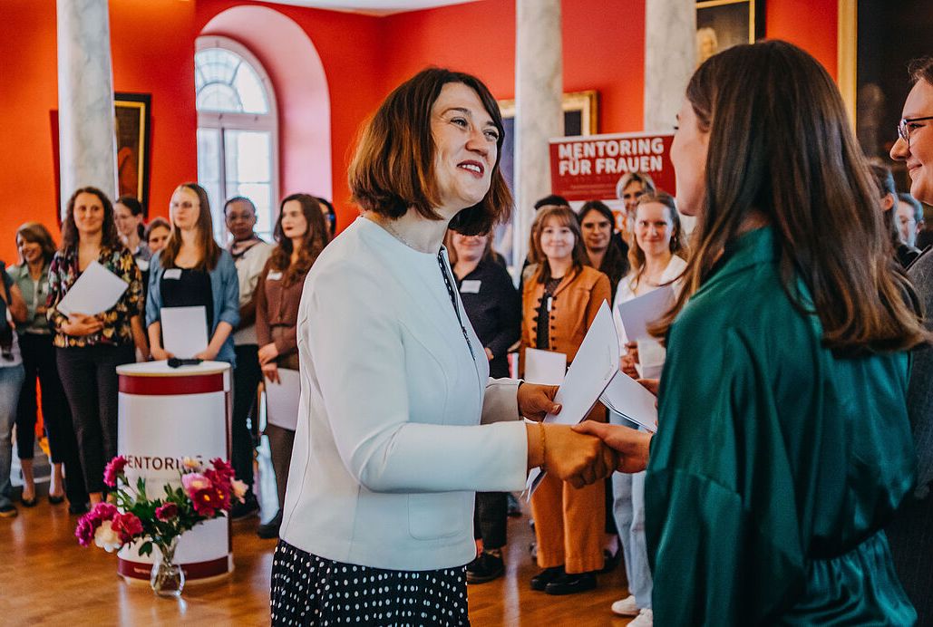 In ihrer Rede hob sie außerdem die gesellschaftliche Bedeutung des Projekts hervor: „Programme wie das KarriereWegeMentoring stärken nicht nur Karrieren. Wichtig ist auch, dass sie das Rückgrat gegen Anfeindungen, Ausgrenzungen, Hass und Hetze stärken. Das Projektteam stemmt sich entschieden gegen diese Entwicklungen und nimmt auch das Thema ‚Antifeminismus‘ in den Angeboten in den Blick.“