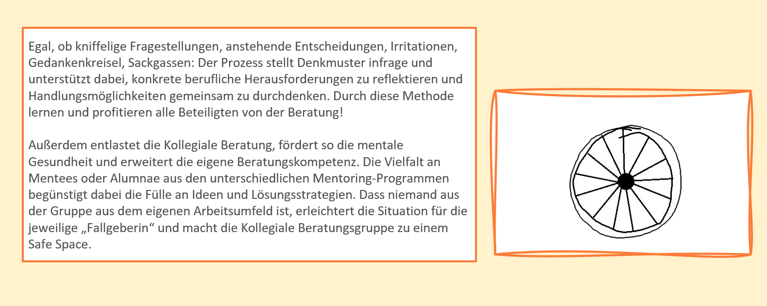 Eine Kollegiale Beratung ermöglicht, sich nach einer vorgegebenen Ablaufstruktur in einer kleinen Gruppe (5 – 8 Pers) wechselseitig auf Augenhöhe zu beraten. Dabei steht die jeweilige „Fallgeberin“ sowie ihre Suche nach einem für sie passenden Lösungsschritt im Mittelpunkt.